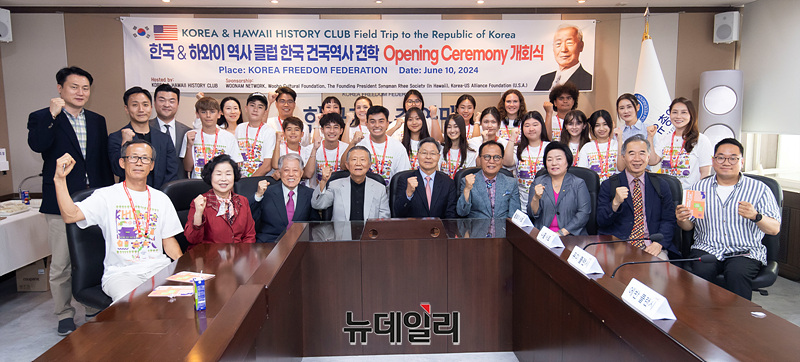 KHHC(코리아 앤 하와이 히스토리 클럽)학생들이 10일 오후 서울 중구 한국자유총연맹에서 열린 KHHC 개회식에서 기념촬영을 하고 있다.