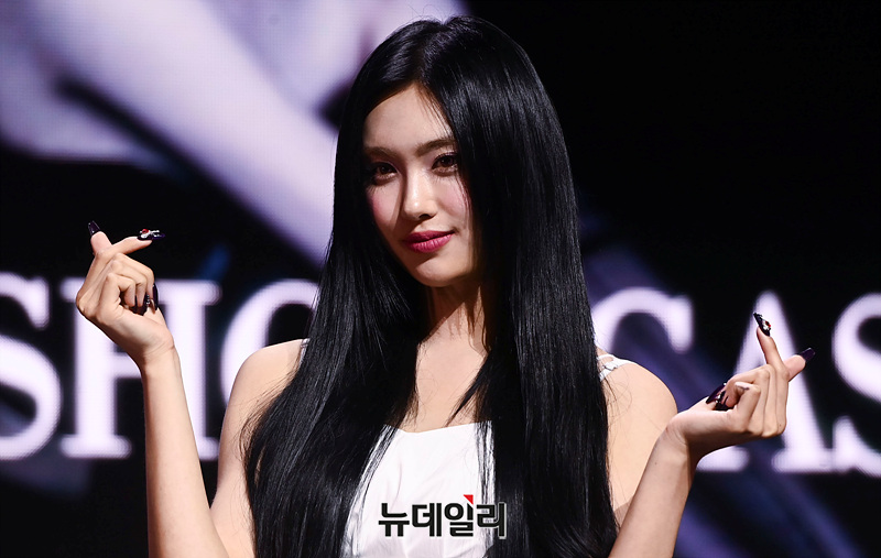 걸그룹 '에버글로우(EVERGLOW)' 아샤가 10일 오후 서울 용산구 블루스퀘어에서 열린 다섯 번째 싱글앨범 '좀비(ZOMBIE)' 쇼케이스에서 포즈를 취하고 있다.