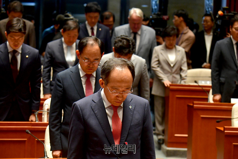 [포토] 국민의례 하는 추경호 국민의힘 원내대표