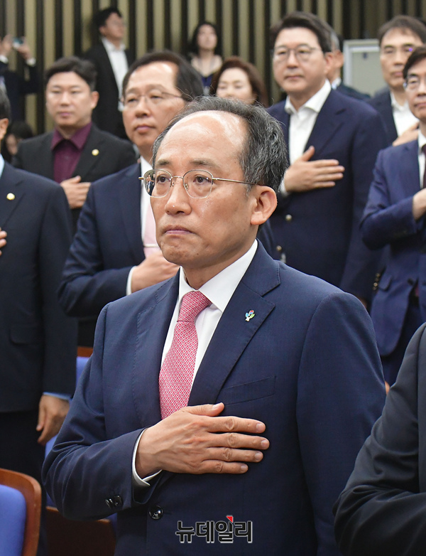추경호 국민의힘 원내대표가 11일 오전 국회에서 열린 의원총회에 참석해 국민의례를 하고 있다.