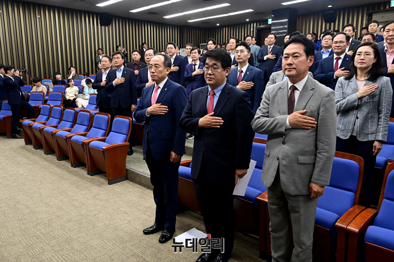 [포토] 의총서 국민의례 하는 국민의힘 의원들