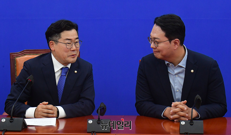 천하람 개혁신당 원내대표가 11일 오후 국회에서 박찬대 더불어민주당 원내대표를 예방해 환담을 나누고 있다.