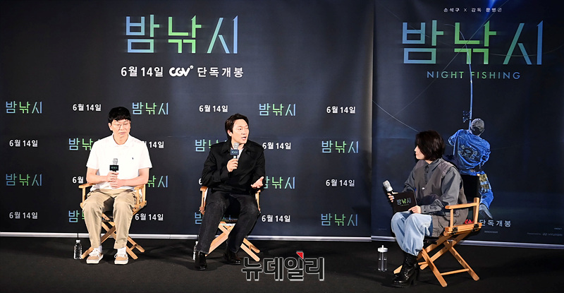배우 손석구와 문병곤 감독이 11일 오후 서울 CGV용산아이파크몰에서 열린 단편영화 '밤낚시' 언론시사회에서 인사하고 있다.