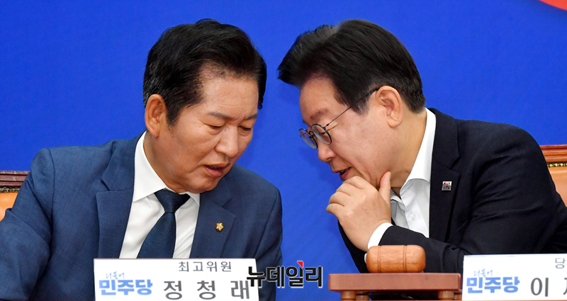 이재명 더불어민주당 대표가 12일 오전 국회에서 열린 최고위원회의에 정청래 최고위원과 대화를 나누고 있다.