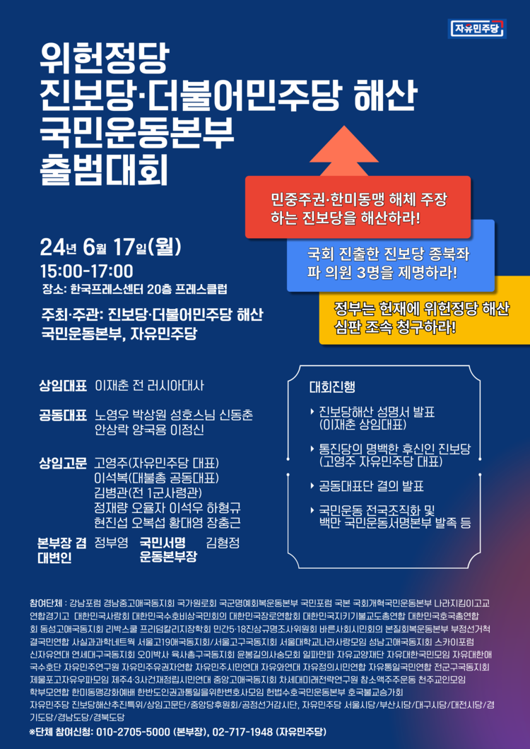 제22대 국회의원 총선거에서 3명의 당선인을 배출한 진보당에 해산을 촉구하는 '진보당·더불어민주당 해산 국민운동본부'가 출범대회를 연다.자유민주당이 주최하는 이번 행사는 오는 17일 서울 중구 한국프레스센터에서 진행된다.이날 행사는 상임대표를 맡은 이재춘 전 러시아대사의 '진보당 해산 성명서' 발표로 포문을 연다.이어 공동대표단의 결의 발표, 국민운동 전국 조직화 및 백만 국민운동서명본부 발족 등 순서로 진행된다.앞서 자유민주당은 지난달 14일 법무부에 진보당 해산 심판 청구서를 제출했다.고영주 자유민주당 대표는 "진보당은 강령에서 민중주권을 주장하고 있어 자유민주적 기본질서를 위배하는 위헌 정당임이 명백하다"고 주장했다.또 "결국 노동자가 주인이 된다는 공산주의 이념의 선전이라며"며 "민중주권 역시 공산주의의 변종인 민중민주주의 이념의 선전"이라고 비판했다.한편 헌법재판소는 2014년 12월 헌정사상 최초로 통합진보당 강제 해산 결정을 내린 바 있다.당시 통진당 소속 국회의원 5명은 의원직을 상실했고 해산 결정에 대한 재심 청구도 2016년 최종 각하됐다.