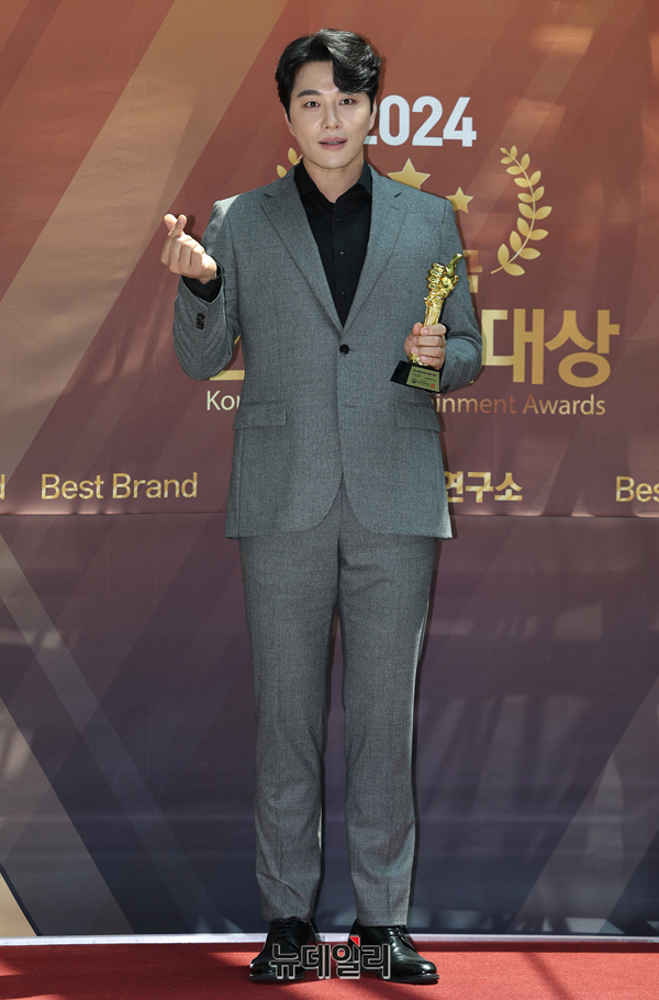 뮤지컬배우 민우혁이 14일 오전 서울 여의도 국회의원회관에서 열린 '2024 대한민국 베스트브랜드 어워즈-대한민국 한류연예대상' 시상식에서 기념촬영을 하고 있다.