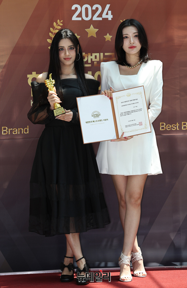 걸그룹 엑신이 14일 오전 서울 여의도 국회의원회관에서 열린 '2024 대한민국 베스트브랜드 어워즈-대한민국 한류연예대상' 시상식에서 기념촬영을 하고 있다.
