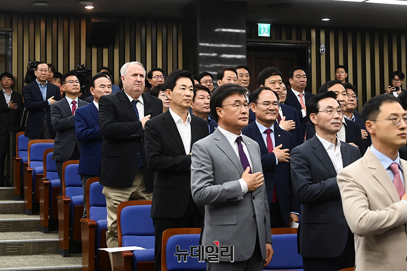 국민의힘 의원들이 17일 오전 서울 여의도 국회에서 열린 의원총회에서 국민의례를 하고 있다.