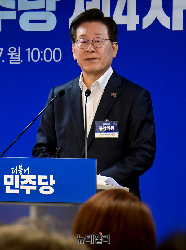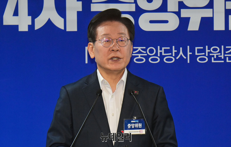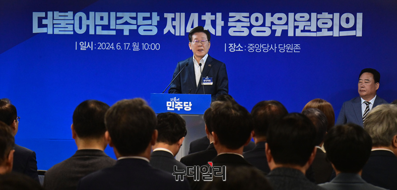 이재명 더불어민주당 대표가 17일 오전 서울 여의도 민주당 중앙당사에서 열린 제4차 중앙위원회의에 참석해 인사말을 하고 있다.