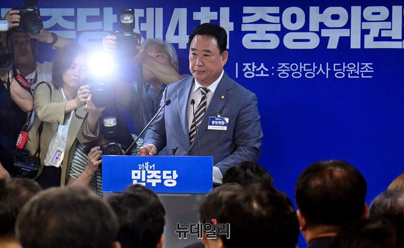 어기구 더불어민주당 중앙위원장이 17일 오전 서울 여의도 중앙당사에서 열린 중앙위원회의에 참석해 당헌 개정 안건을 상정하고 있다.