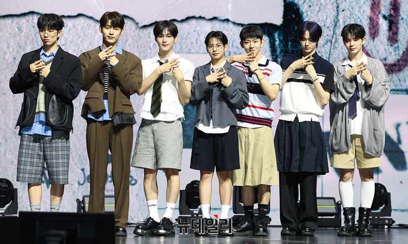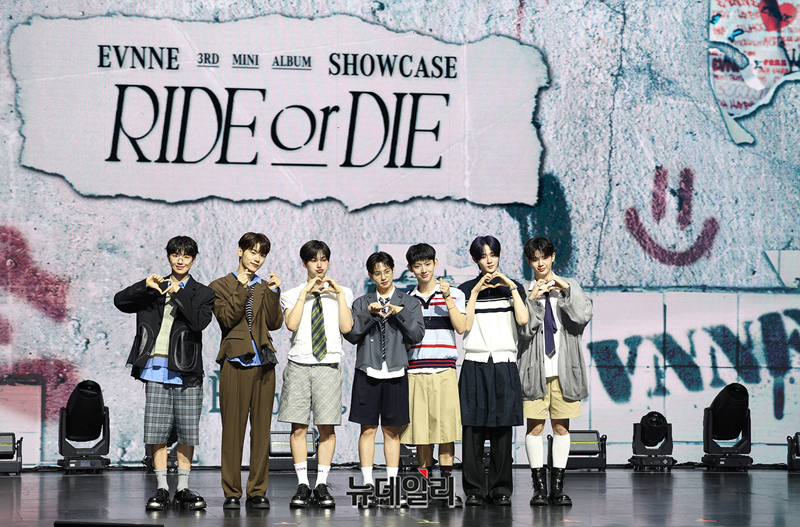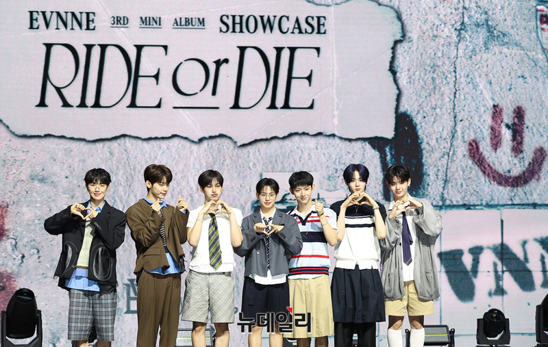 아이돌그룹 이븐(EVNNE)이 17일 오후 서울 광진구 예스24 라이브홀에서 열린 3번째 미니앨범 'RIDE or DIE(라이브 오브 다이)' 쇼케이스에서 포토타임을 갖고 있다.