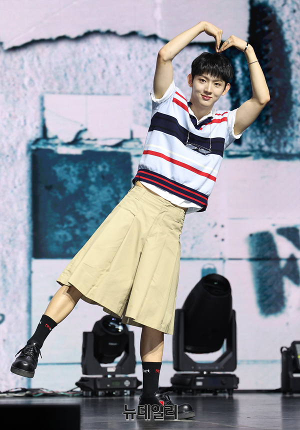 아이돌그룹 이븐(EVNNE) 유승언이 17일 오후 서울 광진구 예스24 라이브홀에서 열린 3번째 미니앨범 'RIDE or DIE(라이브 오브 다이)' 쇼케이스에서 포토타임을 갖고 있다.