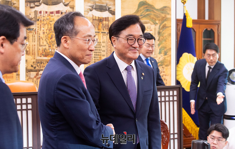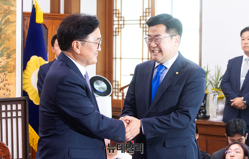 우원식 국회의장이 17일 오후 서울 여의도 국회의장실에서 박찬대 더불어민주당 원내대표, 추경호 국민의힘 원내대표와 인사를 나누고 있다.