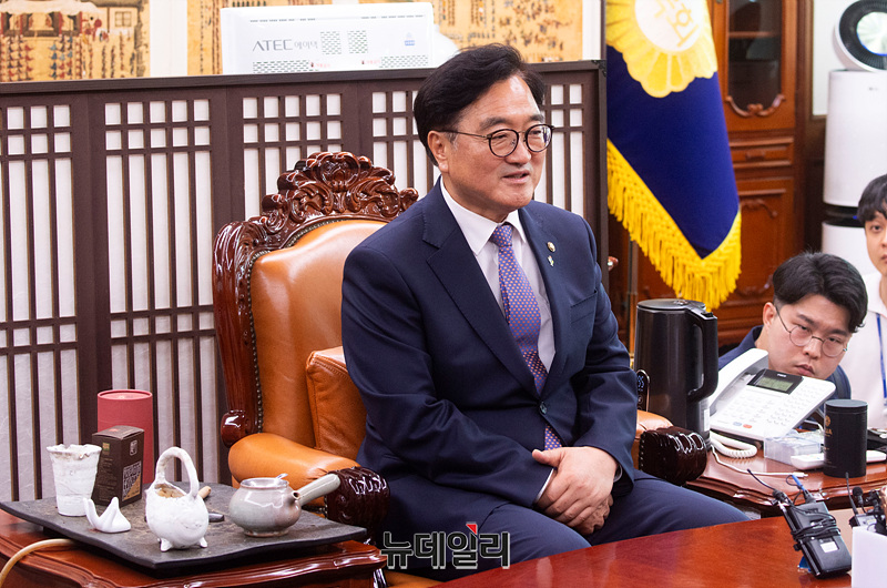 우원식 국회의장이 17일 오후 서울 여의도 국회의장실에서 '국회 원 구성' 관련 논의에 앞서 인사말을 하고 있다.