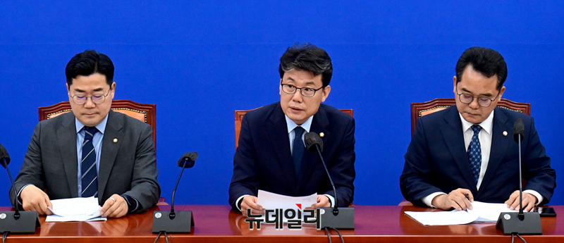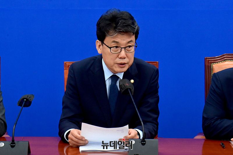 진성준 더불어민주당 정책위의장이 18일 오전 국회에서 열린 원내대책회의에 참석해 모두발언을 하고 있다.