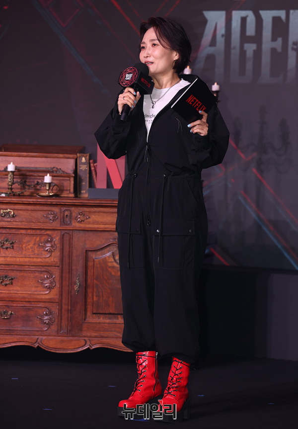 방송인 박경림이 18일 오전 서울 마포구 호텔 나루에서 열린 넷플릭스 '미스터리 수사단' 제작보고회에서 출연자를 소개하고 있다.