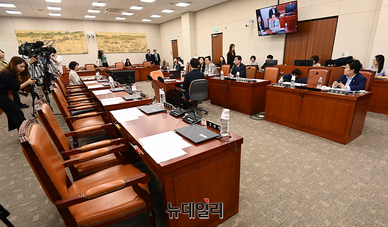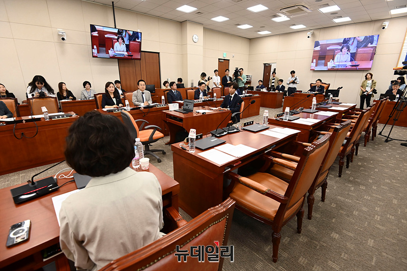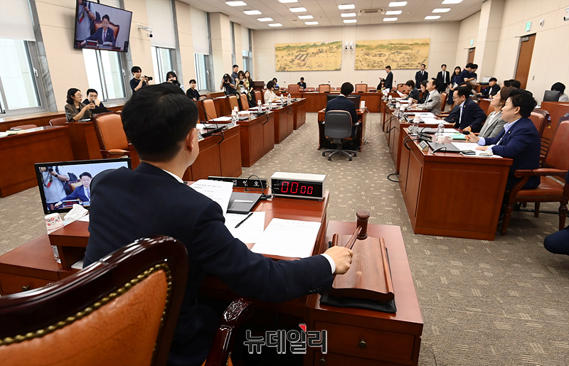 김영호 국회 교육위원회 위원장이 18일 오전 서울 여의도 국회에서 열린 교육위원회 전체회의에서 의사봉을 두드리고 있다.