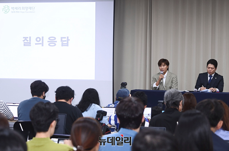 박세리 박세리희망재단 이사장이 18일 오후 서울 강남구 스페이스쉐어 삼성코엑스센터에서 열린 '부친 사문서 위조 혐의' 관련 기자회견에서 입장을 밝히고 있다.