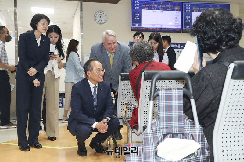 추경호 국민의힘 원내대표가 18일 오전 서울 동작구 보라매병원을 찾아 이재협 병원장과 대화를 나누며 이동하고 있다. (사진=국민의힘)