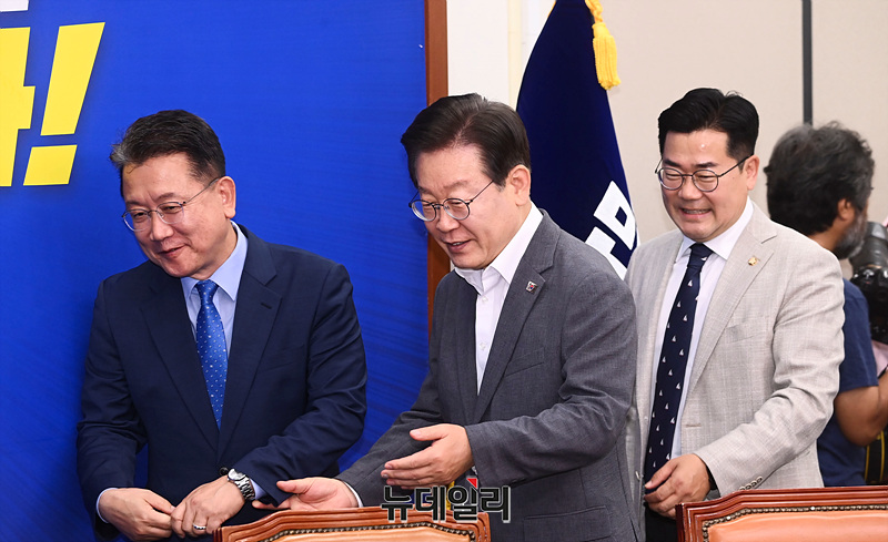 이재명 더불어민주당 대표가 19일 오전 서울 여의도 국회에서 열린 최고위원회의에 참석하고 있다.