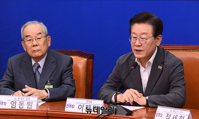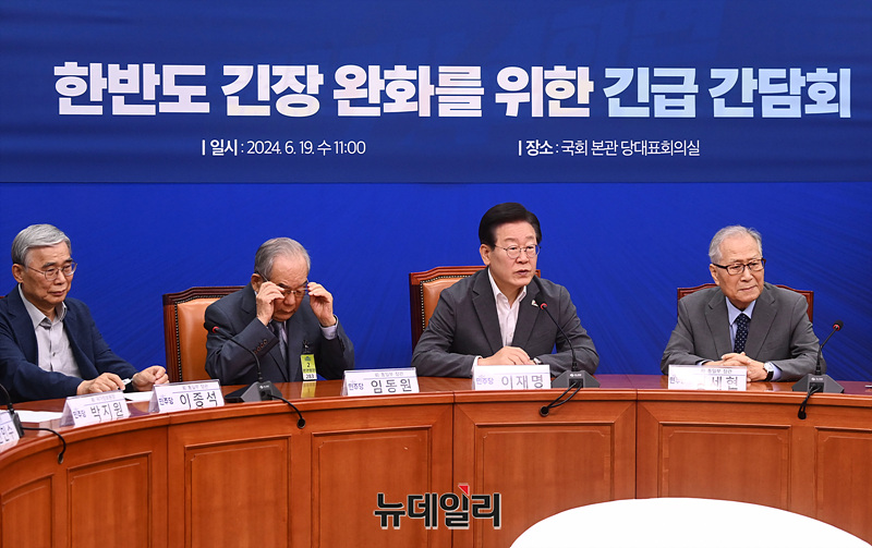 이재명 더불어민주당 대표가 19일 오전 서울 여의도 국회에서 열린 '한반도 긴장 완화를 위한 긴급 간담회'에서 모두발언을 하고 있다.