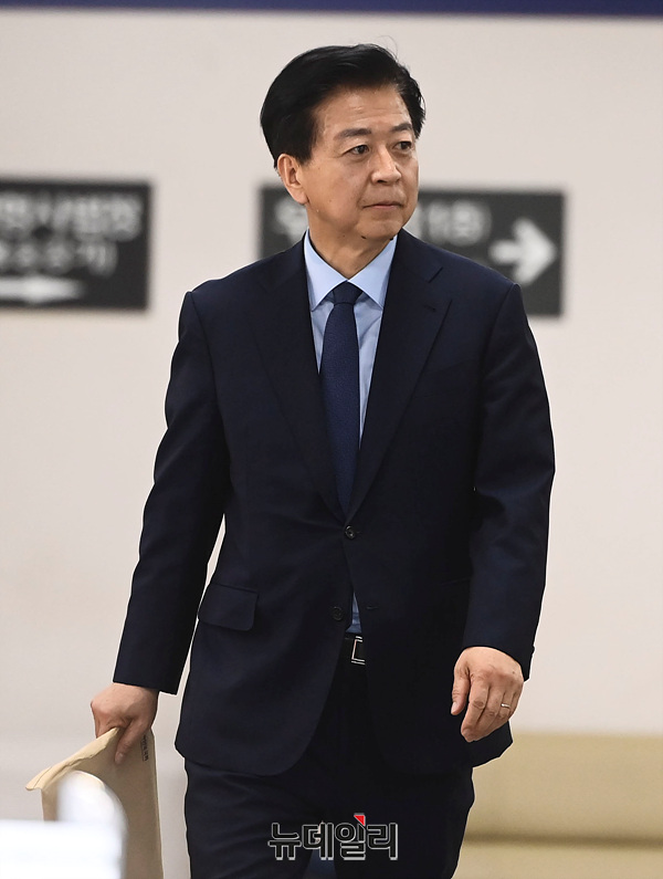 수천만원대 뇌물과 불법 정치자금을 받은 혐의로 재판에 넘겨진 노웅래 전 더불어민주당 의원이 19일 오전 서울 서초구 중앙지법에서 열린 공판에 출석하고 있다.