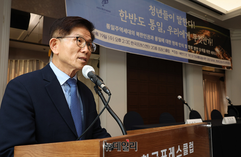 김문수 경제사회노동위원회 위원장이 19일 오후 서울 중구 한국프레스센터에서 열린 북한인권 세미나에서 축사를 하고 있다.이날 세미나는 북한인권개선과자유통일을위한모임(NANK)과 한반도청년미래포럼이 공동 주최로 '통일주역세대의 북한인권과 통일에 대한 현재 인식 및 향후 방안'을 주제로 진행됐다.세미나는 박준규 한반도청년미래포럼 창립자가 좌장을 맡아 최명섭 변호사, 김자훈 미국변호사, 김일혁 한반도청년미래포럼 북한인권 매니저, 오영택 NANK사업국장이 토론에 나섰다.