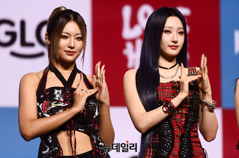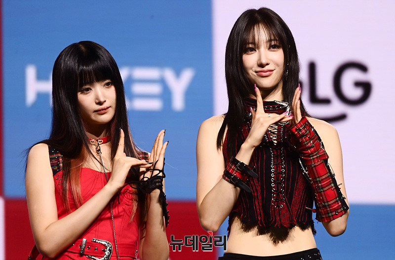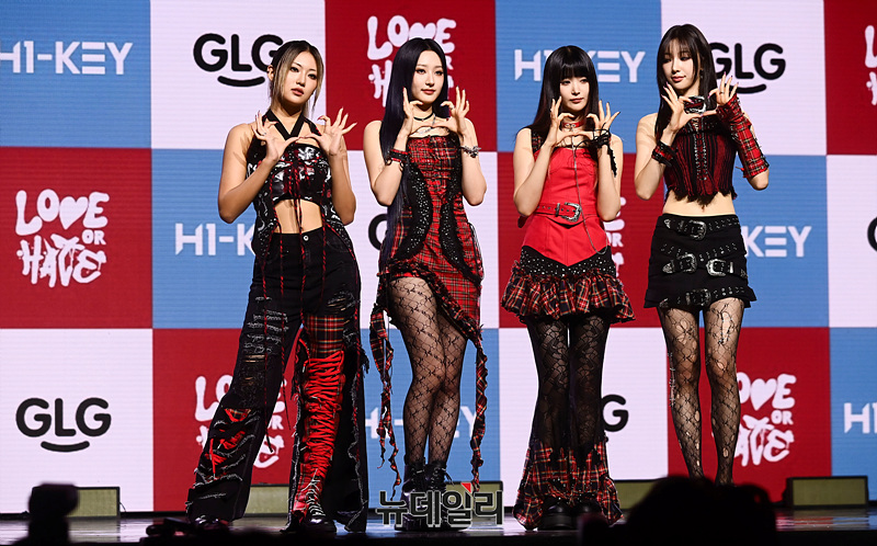 걸그룹 하이키(H1-KEY) 옐, 휘서, 서이, 리이나가 19일 오후 서울 용산구 블루스퀘어에서 열린 세 번째 미니앨범 '러브 오어 헤이트(Love or HATE)' 발매 기념 쇼케이스에서 포즈를 취하고 있다.