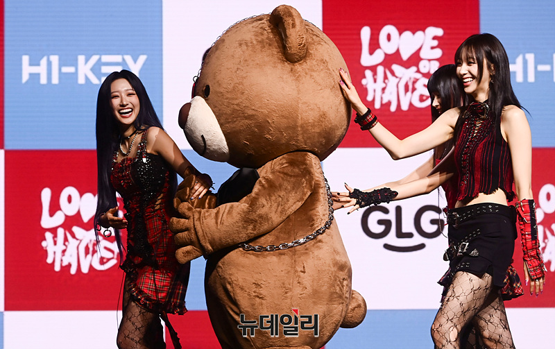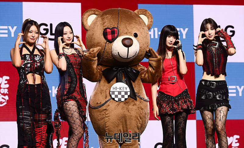 걸그룹 하이키(H1-KEY) 옐, 휘서, 서이, 리이나가 19일 오후 서울 용산구 블루스퀘어에서 열린 세 번째 미니앨범 '러브 오어 헤이트(Love or HATE)' 발매 기념 쇼케이스에서 포즈를 취하고 있다.