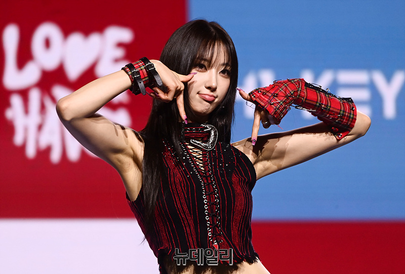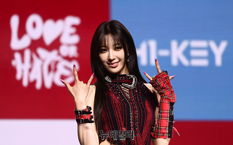 걸그룹 하이키(H1-KEY) 리이나가 19일 오후 서울 용산구 블루스퀘어에서 열린 세 번째 미니앨범 '러브 오어 헤이트(Love or HATE)' 발매 기념 쇼케이스에서 포즈를 취하고 있다.
