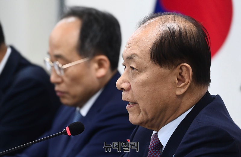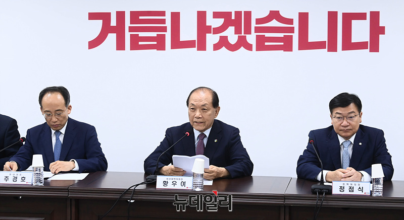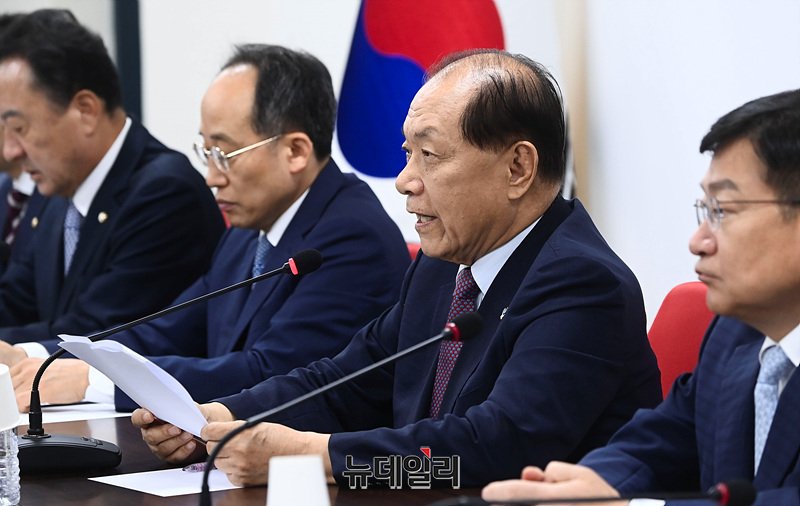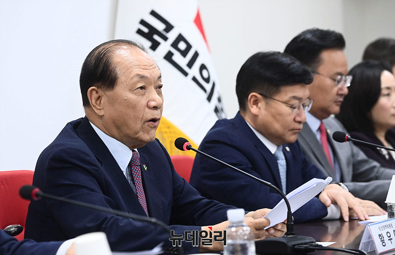 황우여 국민의힘 비상대책위원장이 20일 오전 서울 여의도 국민의힘 중앙당사에서 열린 비상대책위원회의에서 모두발언을 하고 있다.