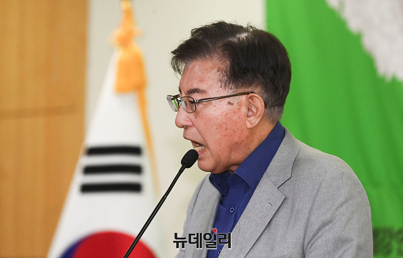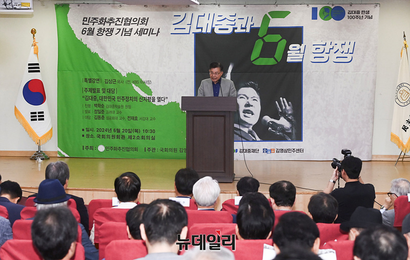 김덕룡 민주화추진협의회 이사장이 20일 오전 서울 여의도 국회 의원회관에서 열린 '김대중 탄생 100주년, 6월 민주항쟁 기념 세미나'에서 인사말을 하고 있다.