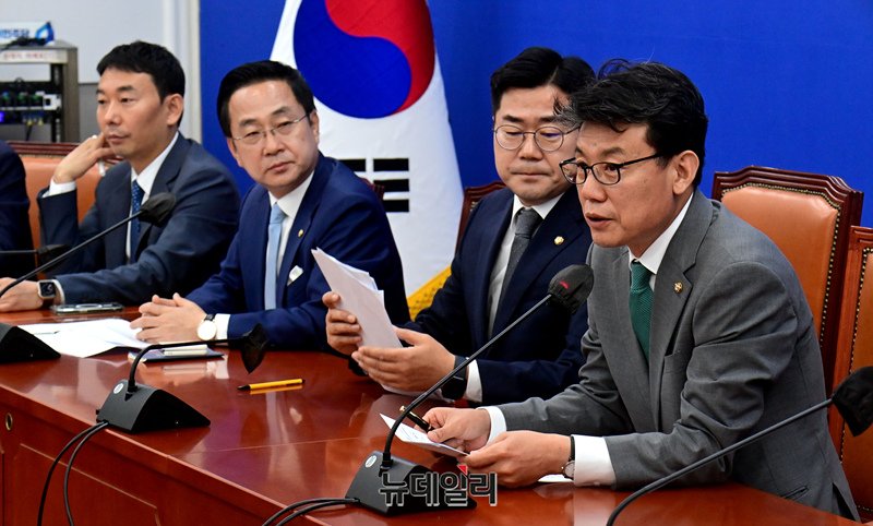 진성준 더불어민주당 정책위의장이 20일 오전 국회에서 열린 원내대책회의에 참석해 모두발언을 하고 있다.