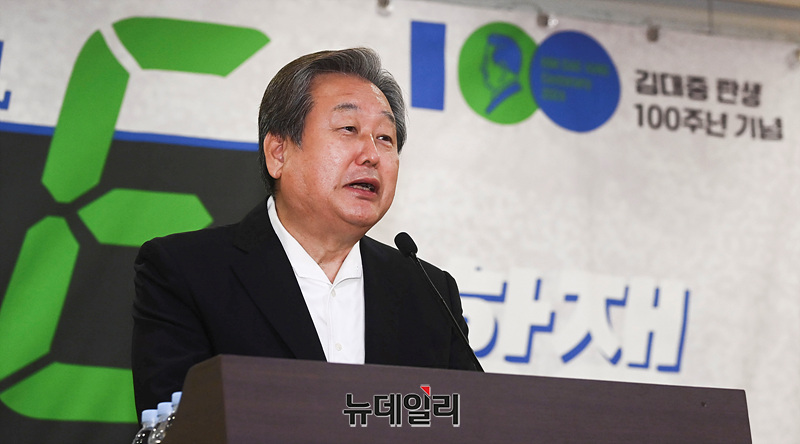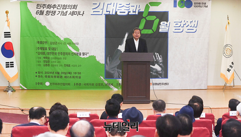 김무성 민주화추진협의회 회장이 20일 오전 서울 여의도 국회 의원회관에서 열린 '김대중 탄생 100주년, 6월 민주항쟁 기념 세미나'에서 인사말을 하고 있다.