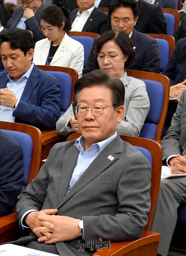이재명 더불어민주당 대표가 20일 오후 국회에서 열린 긴급 의원총회에서 참석해 앉아 있다.