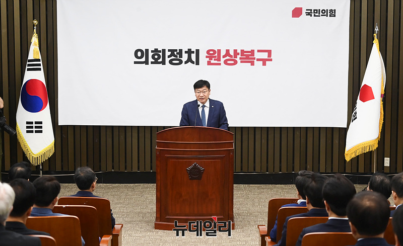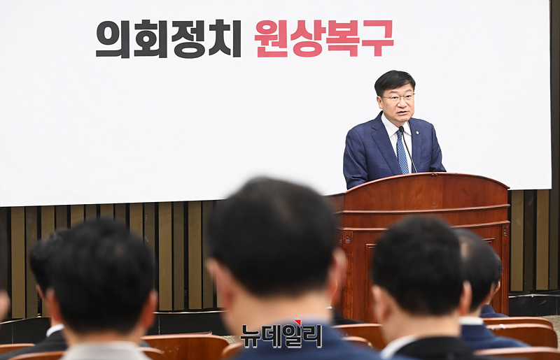 정점식 정책위의장이 21일 오전 서울 여의도 국회에서 열린 '의회정치 원상복구 의원총회'에서 정책보고를 하고 있다.