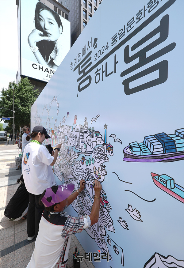 2024 통일문화행사 '통하나 봄' 행사가 개막한 21일 오전 서울 중구 청계광장에서 관람객들이 행사장 한켠에 마련된 벽화에 채색을 하고 있다.