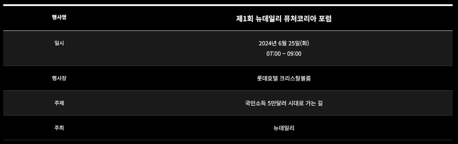 뉴데일리가 '국민소득 5만 달러 시대로 가는 길'을 주제로 오는 6월 25일(화) 제1회 뉴데일리 퓨처코리아 포럼을 오전 7시 롯데호텔 서울 크리스탈볼룸에서 개최합니다. 이날 행사에는 정·재계 인사 500여 명이 참석합니다.뉴데일리는 이번 포럼을 통해 대한민국이 지속가능한 미래와 진정한 선진국 대열에 들어서기 위해 어떤 정책을 수행하고 아젠다를 설정해야 하는지 조망하고자 합니다.또 윤석열 정부가 5만 달러 시대 진입을 위해 추진하는 각종 국정 과제들을 공유하는 자리가 될 것입니다.이번 포럼에서는 나경원 국민의힘 의원과 김연희 보스턴컨설팅(BCG)코리아 대표 파트너가 각각 주제 강연을 합니다.많은 관심 부탁드립니다.포럼 홈페이지https://www.newdaily.co.kr/futurekorea