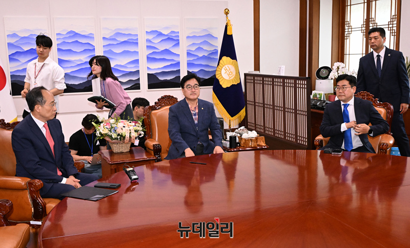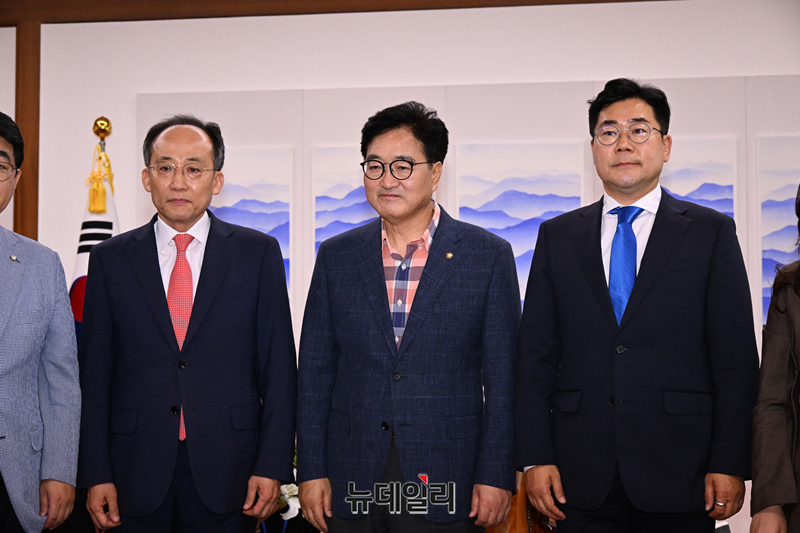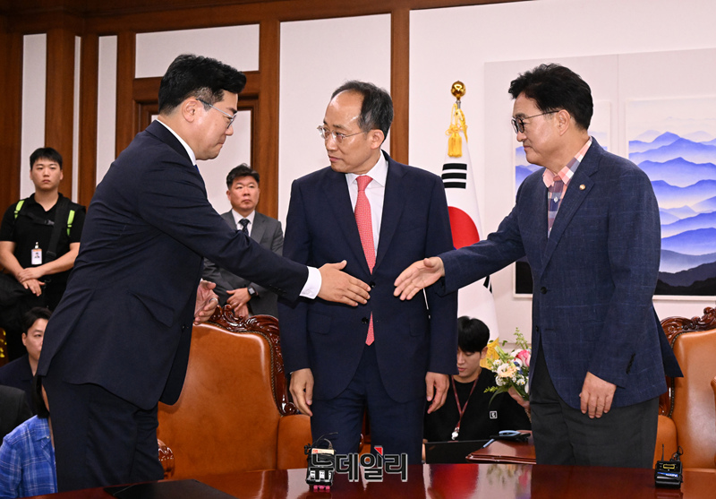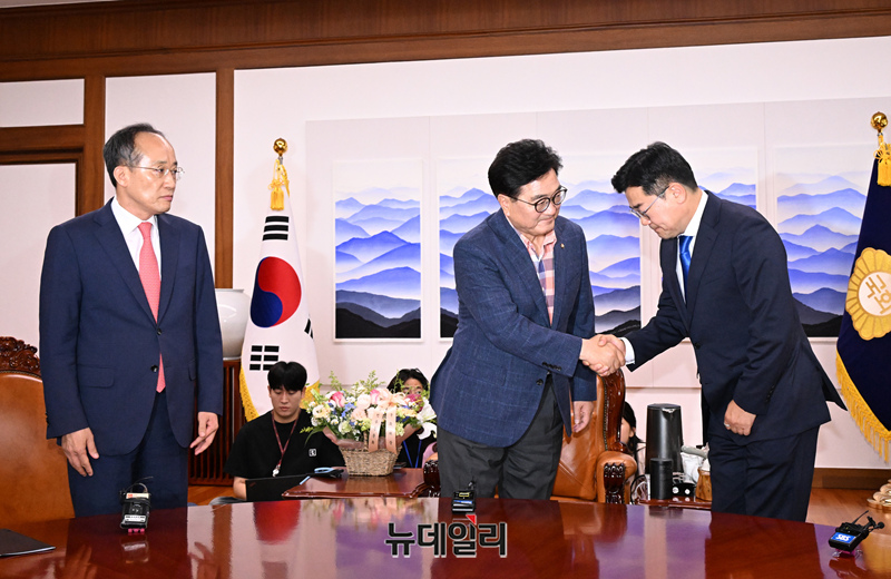 우원식 국회의장(가운데)이 23일 서울 여의도 국회에서 국민의힘 추경호(왼쪽), 더불어민주당 박찬대 원내대표와 원 구성과 관련해 회동하고 있다.