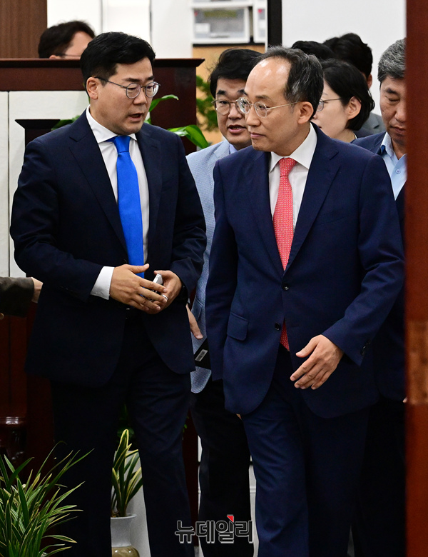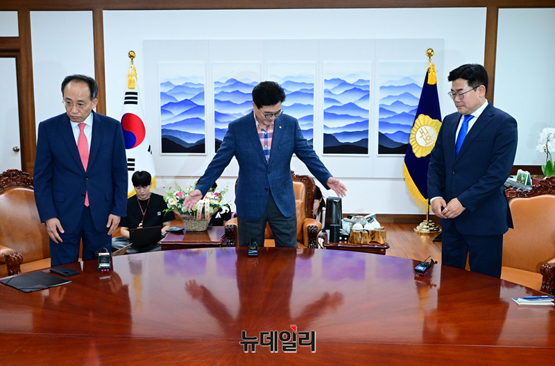 추경호 국민의힘 원내대표와 박찬대 원내대표가 23일 오후 국회에서 열린 국회의장 주재 양당 원내대표 회동에 함께 참석하고 있다.