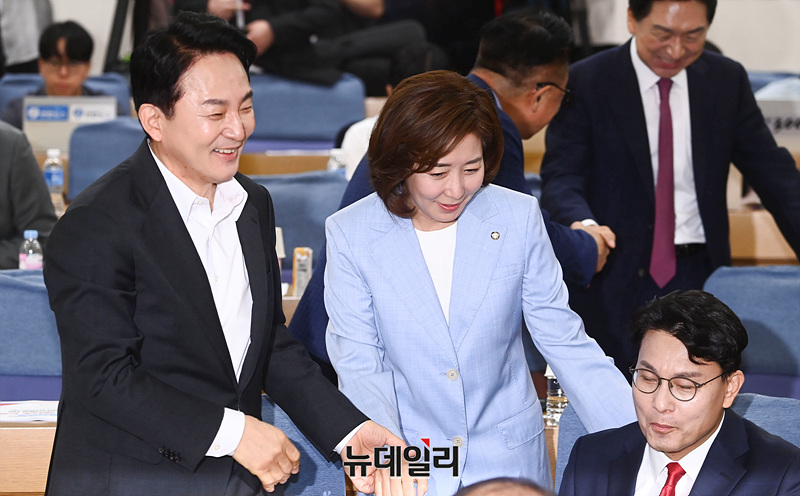 원희룡 전 국토부장관, 나경원 국민의힘 의원, 윤상현 의원이 24일 오전 서울 여의도 국회 의원회관에서 열린 '헌법 제84조 논쟁, 피고인이 대통령 되면 재판이 중단되는가?' 주제로 열린 초선의원 첫번째 공부모임에 참석해 인사를 나누고 있다.