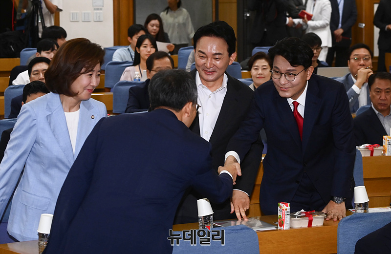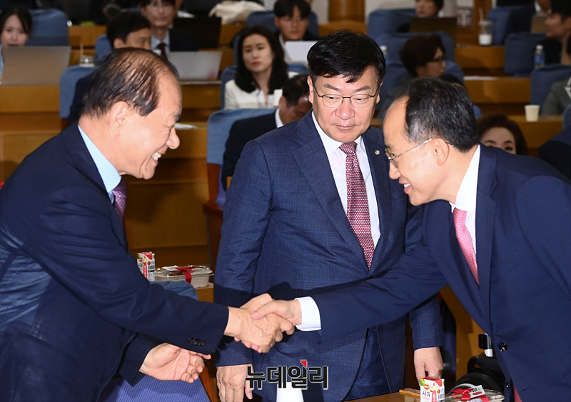 추경호 국민의힘 원내대표가 24일 오전 서울 여의도 국회 의원회관에서 열린 '헌법 제84조 논쟁, 피고인이 대통령 되면 재판이 중단되는가?' 주제로 열린 초선의원 첫번째 공부모임에 참석하며 인사를 나누고 있다.