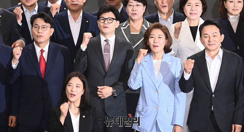 정점식 국민의힘 정책위의장(왼쪽부터), 추경호 원내대표, 윤상현 의원, 한동훈 전 비상대책위원장, 나경원 의원, 원희룡 전 국토부 장관, 황우여 비상대책위원장이 24일 오전 서울 여의도 국회 의원회관에서 열린 '헌법 제84조 논쟁, 피고인이 대통령 되면 재판이 중단되는가?' 주제로 열린 초선의원 첫번째 공부모임에서 기념촬영을 하고 있다.