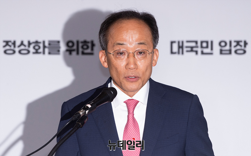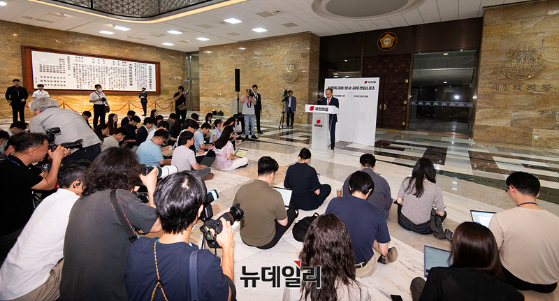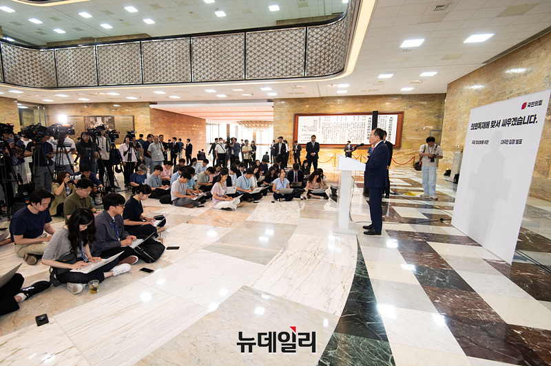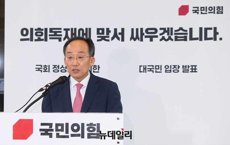 추경호 국민의힘 원내대표가 24일 오전 서울 여의도 국회 로텐더홀에서 '국회 정상화를 위한 대국민 입장 발표'를 하고 있다.