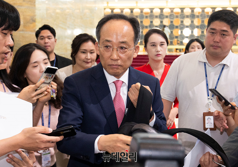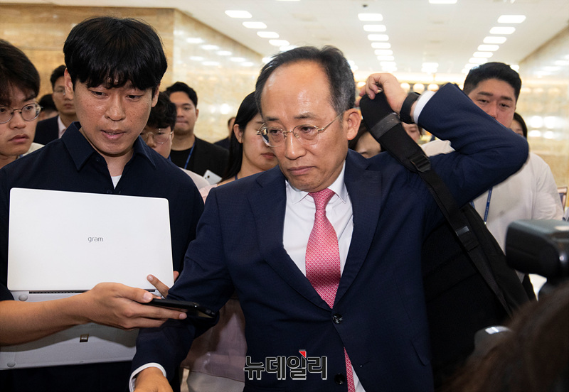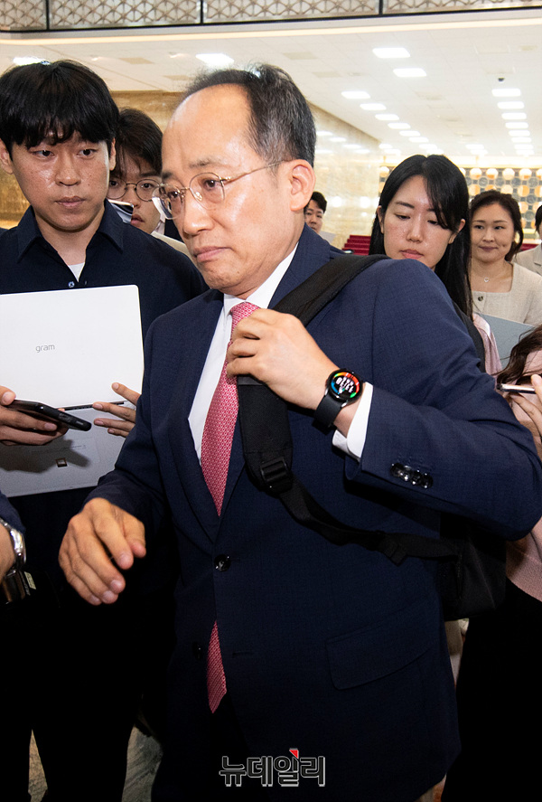 추경호 국민의힘 원내대표가 24일 오전 서울 여의도 국회 로텐더홀에서 '국회 정상화를 위한 대국민 입장 발표'를 마치고 이동하고 있다.