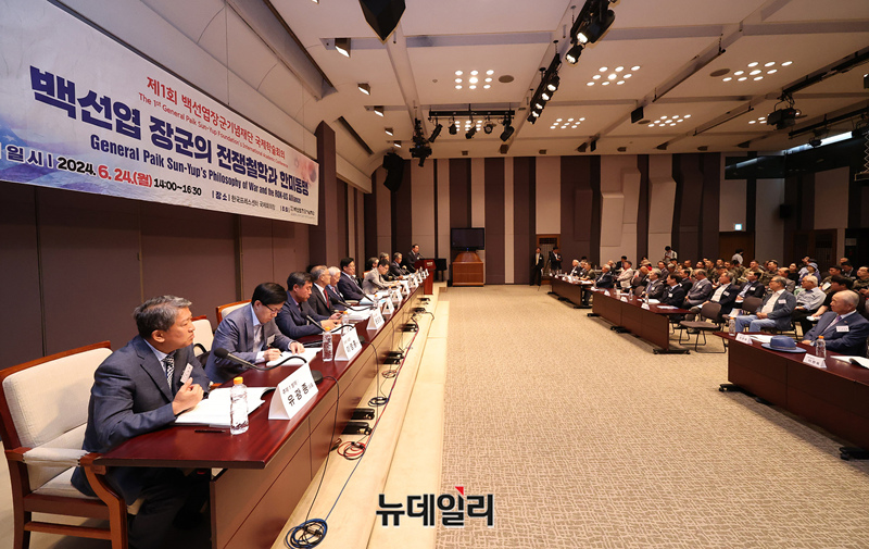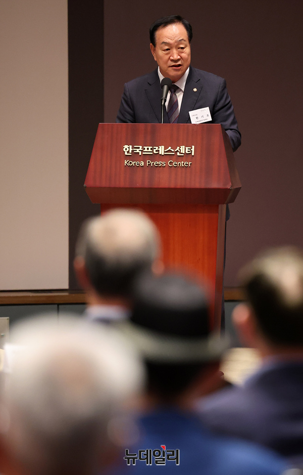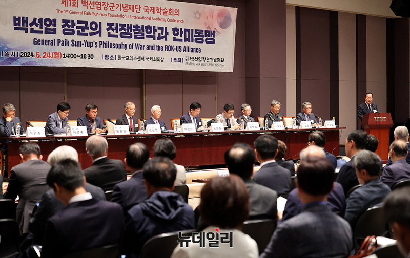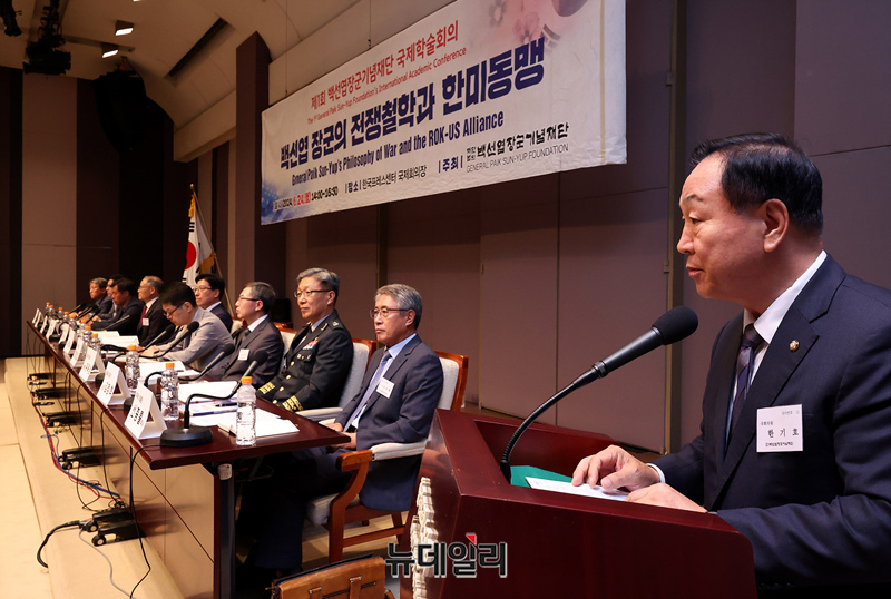 한기호 국민의힘 의원이 24일 오후 서울 중구 한국프레스센터에서 '백선엽 장군의 전쟁철학과 한미동맹'을 주제로 열린 제1회 백선엽장군기념재단 국제학술회의에서 축사를 하고 있다.이날 학술회의는 '6.25전쟁 중의 백선엽 장군과 미군' '백선엽 장군의 전장리더십과 한미동맹' '한미동맹은 강해지고 있는가?'를 주제로 진행됐다.발표는 유광종 종로문화재단 대표, 장삼열 한미안보연구회 사무총장, 유욱상 예비역 준장이 각각 맡았다.토론에는 이영종 한국국가전략연구원 북한연구센터장, 문관현 연합뉴스 국제부장, 김명섭 연세대 교수, 허남성 명예교수, 김정혁 한미연합사단 부단장, 선종률 월간군사저널 회장 등이 맡았다.