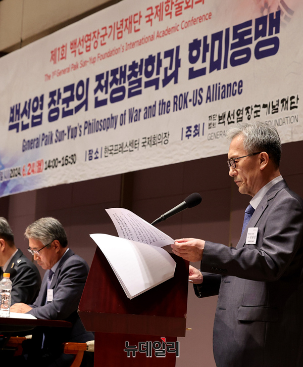 제1회 백선엽장군기념재단 국제학술회의가 24일 오후 서울 중구 한국프레스센터에서 '백선엽 장군의 전쟁철학과 한미동맹'을 주제로 진행되고 있다.이날 학술회의는 '6.25전쟁 중의 백선엽 장군과 미군' '백선엽 장군의 전장리더십과 한미동맹' '한미동맹은 강해지고 있는가?'를 주제로 진행됐다.발표는 유광종 종로문화재단 대표, 장삼열 한미안보연구회 사무총장, 유욱상 예비역 준장이 각각 맡았다.토론에는 이영종 한국국가전략연구원 북한연구센터장, 문관현 연합뉴스 국제부장, 김명섭 연세대 교수, 허남성 명예교수, 김정혁 한미연합사단 부단장, 선종률 월간군사저널 회장 등이 맡았다.