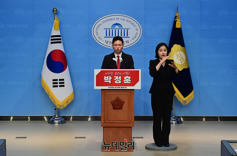 박정훈 국민의힘 의원이 24일 오후 국회 소통관에서 최고위원 출마 기자회견을 하고 있다.