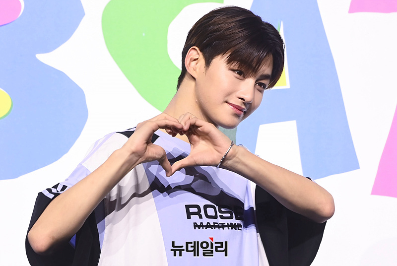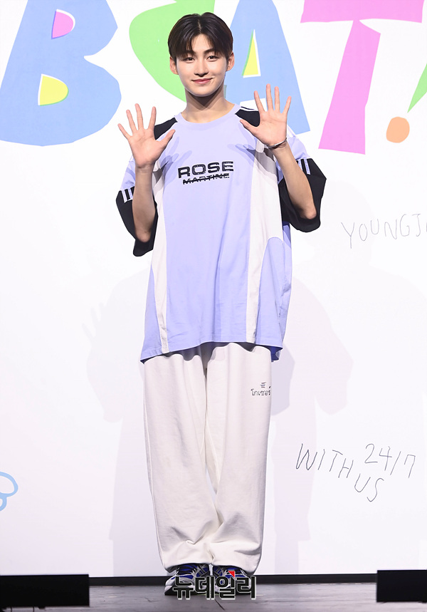 그룹 '투어스(TWS)' 지훈이 24일 오후 서울 용산구 블루스퀘어에서 열린 미니 2집 '서머 비트!(SUMMER BEAT!)' 발매 기념 쇼케이스에서 포즈를 취하고 있다.