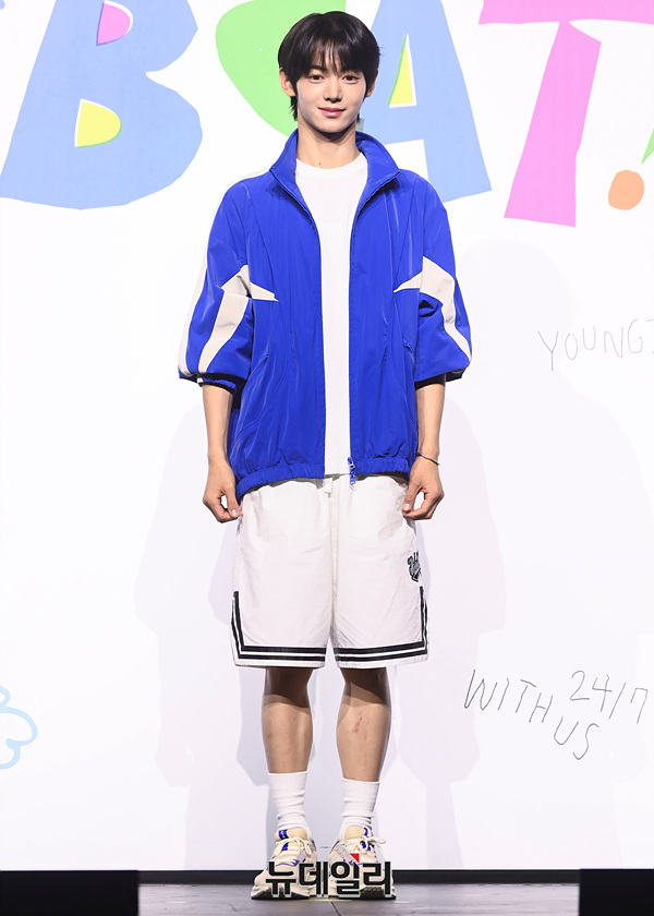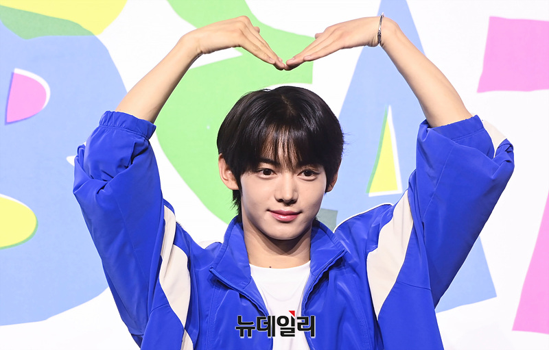 그룹 '투어스(TWS)' 한진이 24일 오후 서울 용산구 블루스퀘어에서 열린 미니 2집 '서머 비트!(SUMMER BEAT!)' 발매 기념 쇼케이스에서 포즈를 취하고 있다.